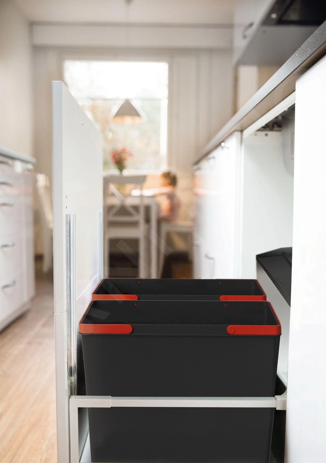 Permite una cómoda clasificación de los residuos. Los cubos para la clasificación de residuos están fabricados con material antiséptico reciclado que reduce las bacterias hasta en un 99%. El sistema se adapta a los muebles de 45 y 60 cm de ancho equipados con un cajón. El sistema EASYSORT ofrece una combinación de 2 tamaños de cubos de basura y permite separar hasta 4 tipos de residuos.